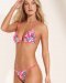 Description: Reversible bikini. Textured fabric. Sliding triangle top with removable soft cups, less coverage, adjustable straps, tied neck and back, special lace toecaps. the panty has cheeky coverage, low rise, sliding sides. Photos show also the reversible print of this bikini.